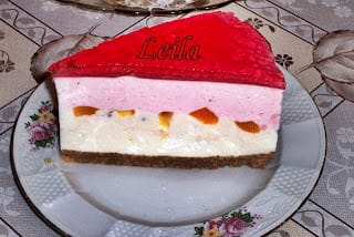 Doar ca mi s-a parut destul de multa gelatina pt cantitatile date.Asadar am adaugat doar cate un plic de gelatina de 10 grame cremelor de iaurt.Unul pt crema cu iaurtul de caise si unul celei cu fructe de padure.Frisca am lasat-o asa fara intaritor.Intre cele doua straturi de creme am introdus unul de piscoturi inmuiate in zeama de pe compot si cateva bucati de caise.