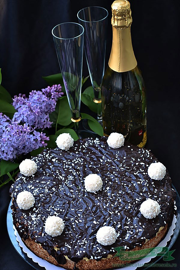 Indepartam hartia de copt din forma, asezam inapoi blatul si deasupra turnam crema dupa care dam forma la rece pentru 1 ora. Deasupra putem glasa cu ciocolata sau putem presara doar nuca de cocos, partea cu ornatul va las pe fiecare sa alegeti ce va convine. Eu am ales varianta glazura ciocolata si decor bomboane Raffaello.