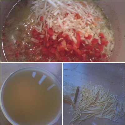 Peste carne se adauga legumele tocate in cubulete(de preferat) in urmatoarea ordine: ceapa, morcovul, pastarnacul, telina si ardeiul gras.