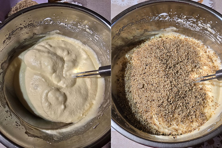 Adaugam faina in care punem praful de copt si nuca macinata la compozitia de oua.