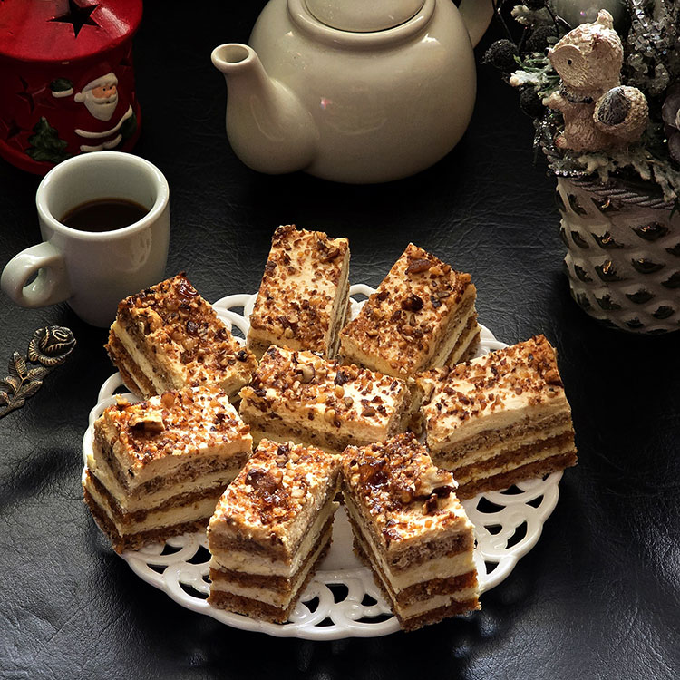 Alta varianta de a orna aceasta prajitura gasiti in cele ce urmeaza. Deasupra putem orna ori cu zahar caramelizat , ori cu glazura de ciocolata . O alta varianta ar fi ca deasupra sa ornam cu cele 3 albusuri (ramase de la galbenusurile folosite la crema) batute spuma cu 150 g zahar pe baie de aburi.